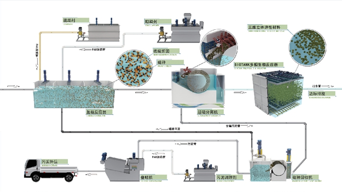 MagBio水環境水質提升技術與工藝,是MagSep超磁分離水體凈化工藝+Biotank多相生物反應箱工藝的串聯組合工藝,兼具了磁分離水處理技術與生化技術的雙重優勢,可同時完成對總磷、SS、COD、氨氮、部分總氮的高效去除,出水可達到地表N類水水質標準,實現綜合水環境水質提升的目標。